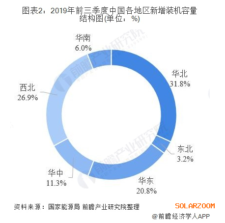 從新增裝機(jī)布局看,我國(guó)光伏發(fā)電由西向東的發(fā)展步伐穩(wěn)步推進(jìn),2019年前三季度,華北地區(qū)新增裝機(jī)508.6萬千瓦,占全國(guó)的31.8%;東北地區(qū)新增裝機(jī)51.2萬千瓦,占全國(guó)的3.2%;華東地區(qū)新增裝機(jī)332.2萬千瓦,占全國(guó)的20.8%;華中地區(qū)新增裝機(jī)180.9萬千瓦,占全國(guó)的11.3%;西北地區(qū)新增裝機(jī)430.8萬千瓦,占全國(guó)的26.9%;華南地區(qū)新增裝機(jī)95.5萬千瓦,占全國(guó)的6%。